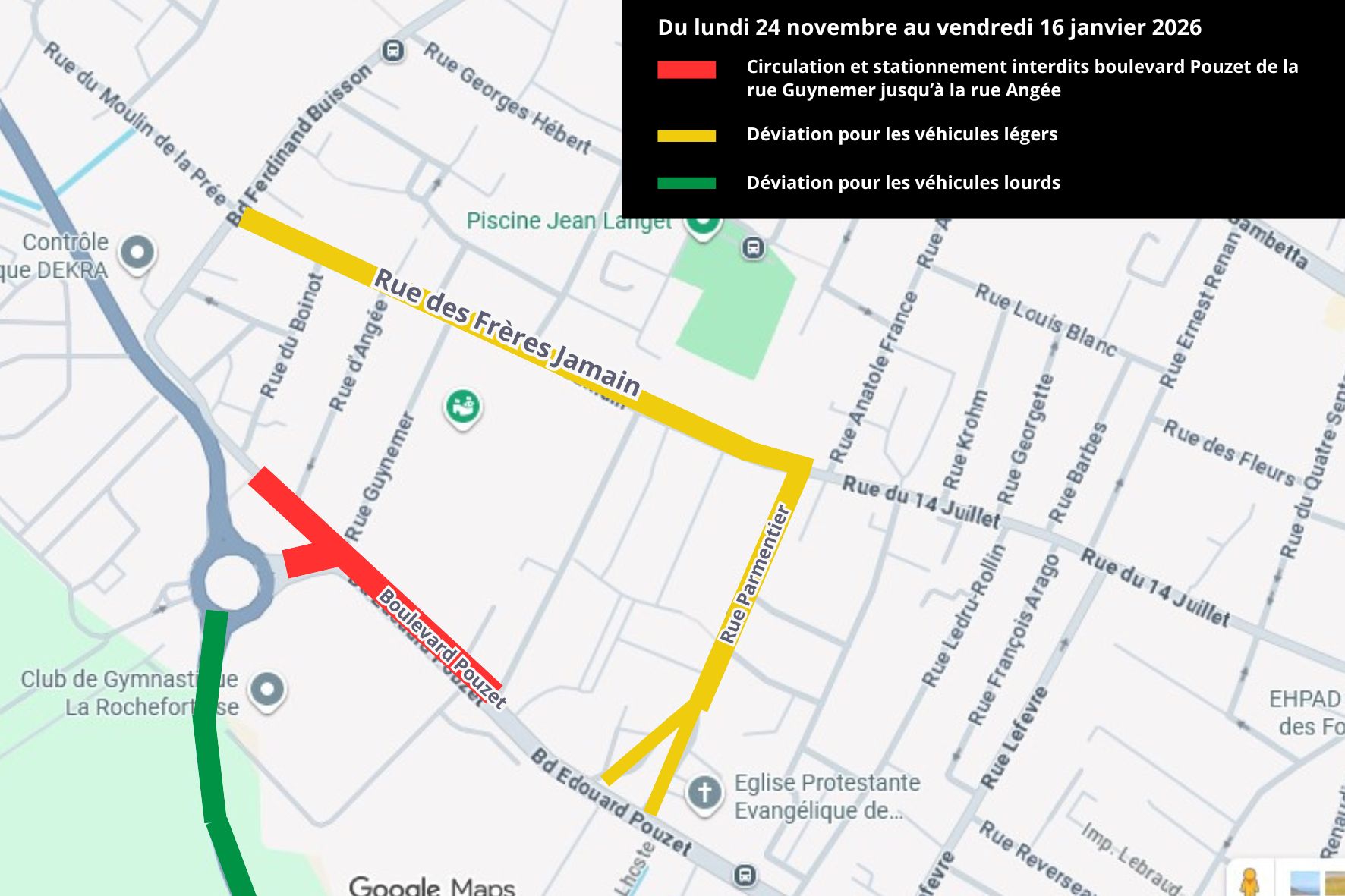 Les travaux du boulevard Pouzet reprennent sur la portion comprise entre les rues Georges Guynemer et la rue Angée. Du 24 novembre au 16 janvier 2026, cette partie sera interdite à la circulation en raison de la réhabilitation totale de la voie.
