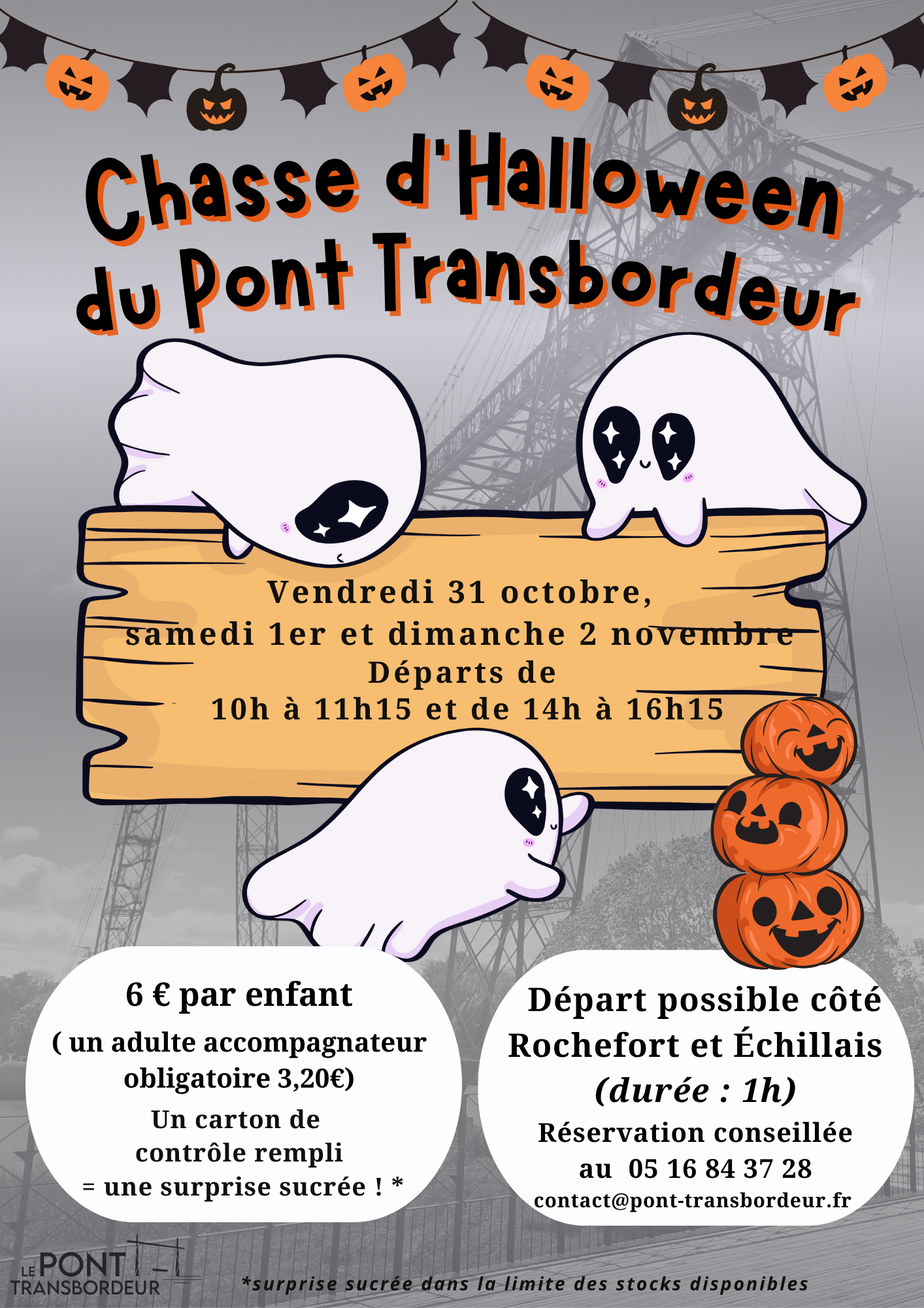 À l'occasion d'Halloween et pour célébrer le dernier week-end d'ouverture du pont Transbordeur en 2025, une chasse d'Halloween est organisée. Cette activité à destination des petits (et des grands) vous offrira l'occasion de partir à la découverte du site au cours d'une chasse d'Halloween. Votre livret de jeu en main, partez à l'aventure sur le site du pont Transbordeur ! À l'aide du livret de jeu, résolvez les énigmes et ouvrez l'œil pour retrouver les poinçons cachés qui vous permettront de compléter votre carton de contrôle.