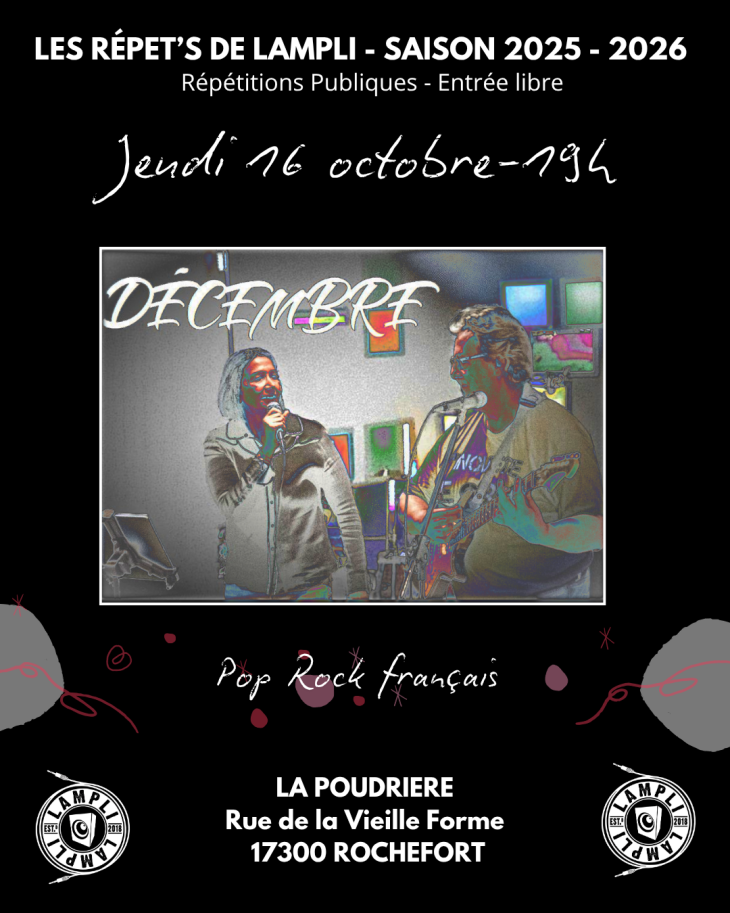 Ajouter à mon Calendrier 2025-10-16 00:00:00 2025-10-16 00:00:00 Les Répet's de LAmpli - Décembre Les Répet’s de LAmpli, c’est l’invitation à disposer, pour des groupes plutôt amateurs et créateurs, d’un espace de répétition , dans des conditions optimales. Sono à disposition disposée en quadriphonie, captation son multipistes et de 2 morceaux en vidéo immersive pour garder trace et servir de support com. Interview radio à chaud possible par Dr No Mad pour Buzz Arts Radio. Ce jeudi, Décembre, duo pop rock, en français. Rochefort Ville de Rochefort gaetanpat@gmail.com Europe/Paris public