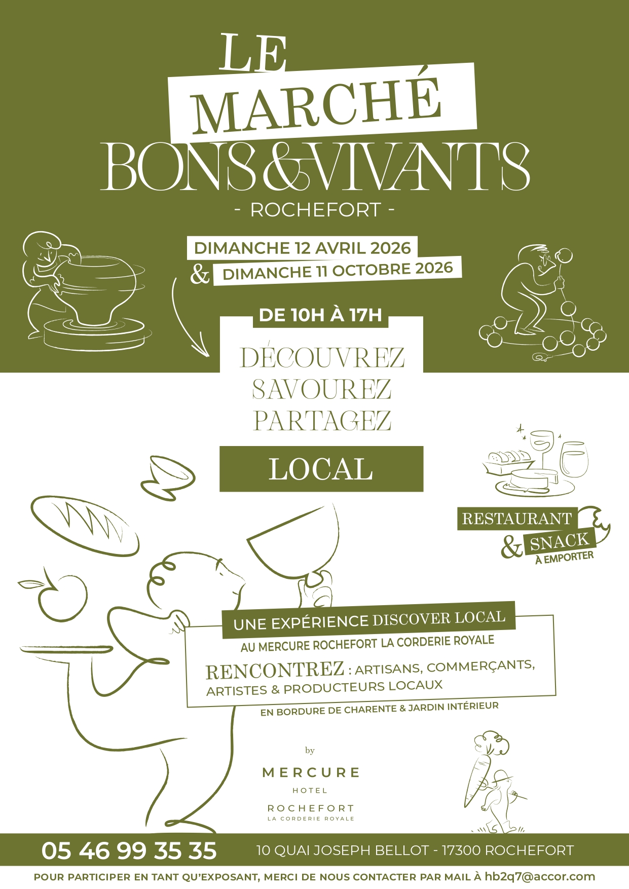 Ajouter à mon Calendrier 2026-04-12 00:00:00 2026-04-12 00:00:00 Marché BONS&VIVANTS En 2026, nous donnerons vie à un projet qui nous tient particulièrement à cœur : la toute première édition du marché local BONS&VIVANTS, organisée au Mercure Rochefort La Corderie Royale… et entièrement ouverte à tous, voyageurs comme habitants de la région. Pensé par Accor exclusivement pour les hôtels Mercure, le programme BONS&VIVANTS invite chacun à vivre une expérience profondément authentique, une immersion dans l’âme et la culture d’un territoire. À Rochefort, cette âme se révèle à travers la douceur de la Charente, la richesse de notre patrimoine maritime, la créativité foisonnante de nos artisans, la passion de nos producteurs et la sensibilité de nos artistes. Dans le cadre enchanteur de notre jardin, entre histoire et nature, ce marché deviendra un lieu de rencontres, de découvertes et d’émerveillement. Une promenade sensorielle où l’on goûte, où l’on observe, où l’on échange… chaque stand révélant une histoire, une passion, un éclat de Charente-Maritime. Nous souhaitons offrir un moment chaleureux, convivial et vibrant, où le savoir-faire local est célébré avec élégance et sincérité. Un marché où l’on vient par curiosité, où l’on reste par plaisir, et où l’on revient pour revivre ce sentiment unique de proximité, de partage et d’authenticité. Bienvenue dans notre univers BONS&VIVANTS, un événement ouvert à tous, où Rochefort dévoile toute sa beauté, son talent et son goût du vrai. Rochefort Ville de Rochefort gaetanpat@gmail.com Europe/Paris public